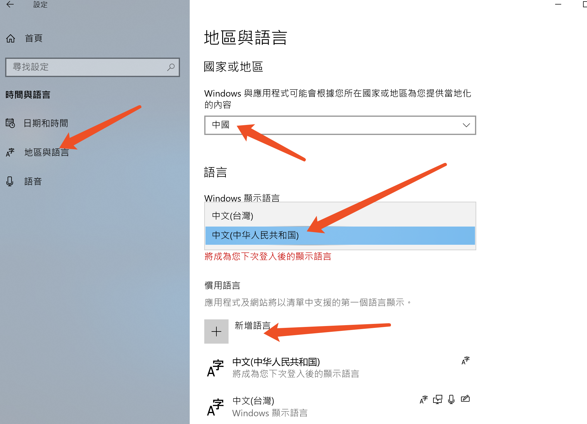 4,接下來在地區與語言中如圖操作,若無中文(中華人民共和國)請添加語言後再選擇!