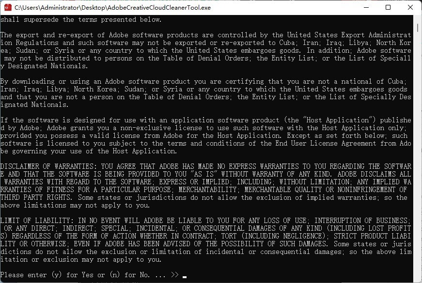 2.查看 Adobe 最终用户许可协议:键入 Y 表示接受,或键入 N 表示拒绝(如果拒绝,则脚本将停止运行)。按下 Enter。
