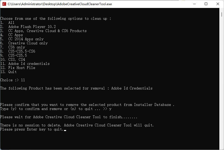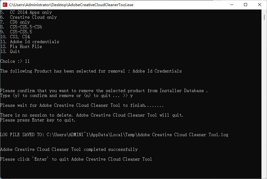 5.在看到消息“Adobe Creative Cloud Cleaner Tool 已成功完成”时,请按 Enter,并重新启动计算机。