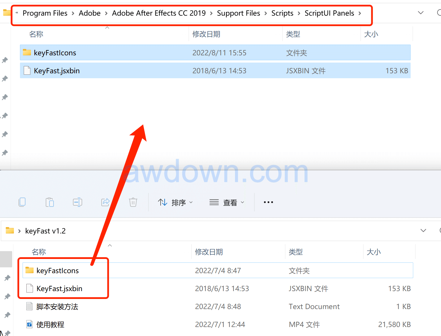 1、复制KeyFast.jsxbin和keyFastIcons文件夹到AE脚本目录: …Adobe After Effects CC\Support Files\Scripts\ScriptUI Panels\