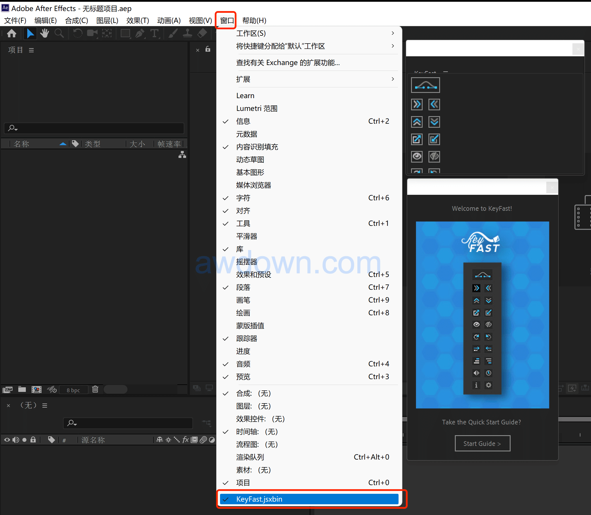 3、在软件顶部window窗口菜单下即可看到KeyFast.jsxbin脚本