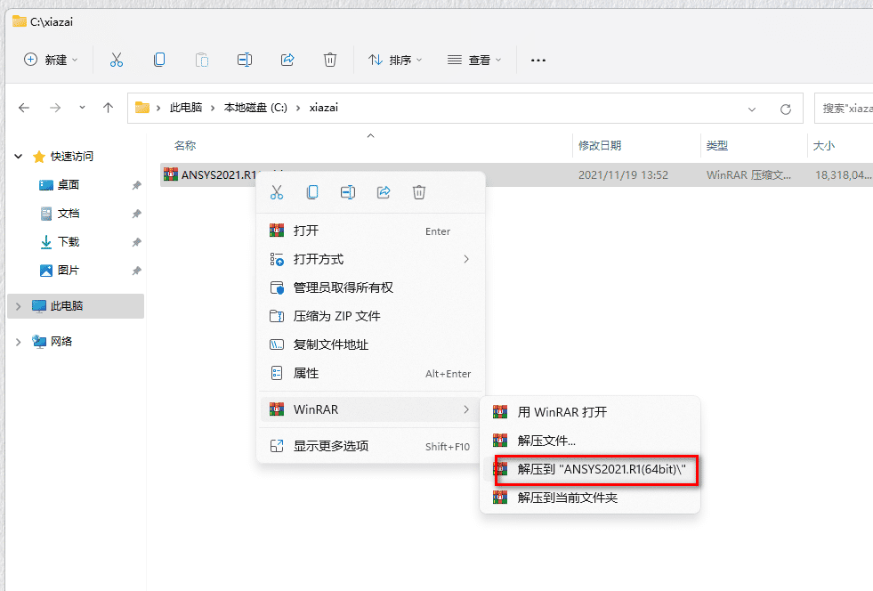 1、鼠标右击【ANSYS2021.R1(64bit)】压缩包选择【解压到 ANSYS2021.R1(64bit)】