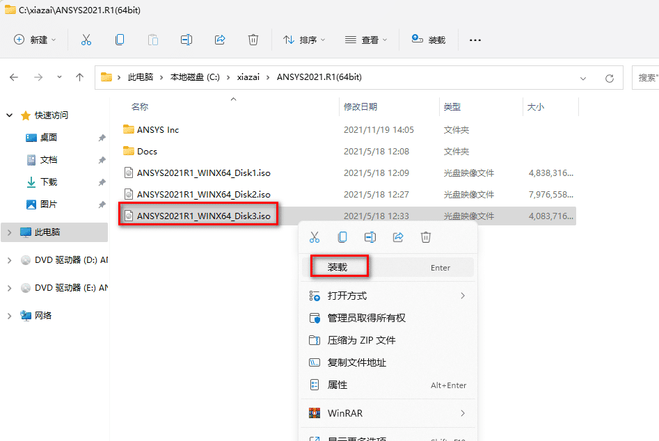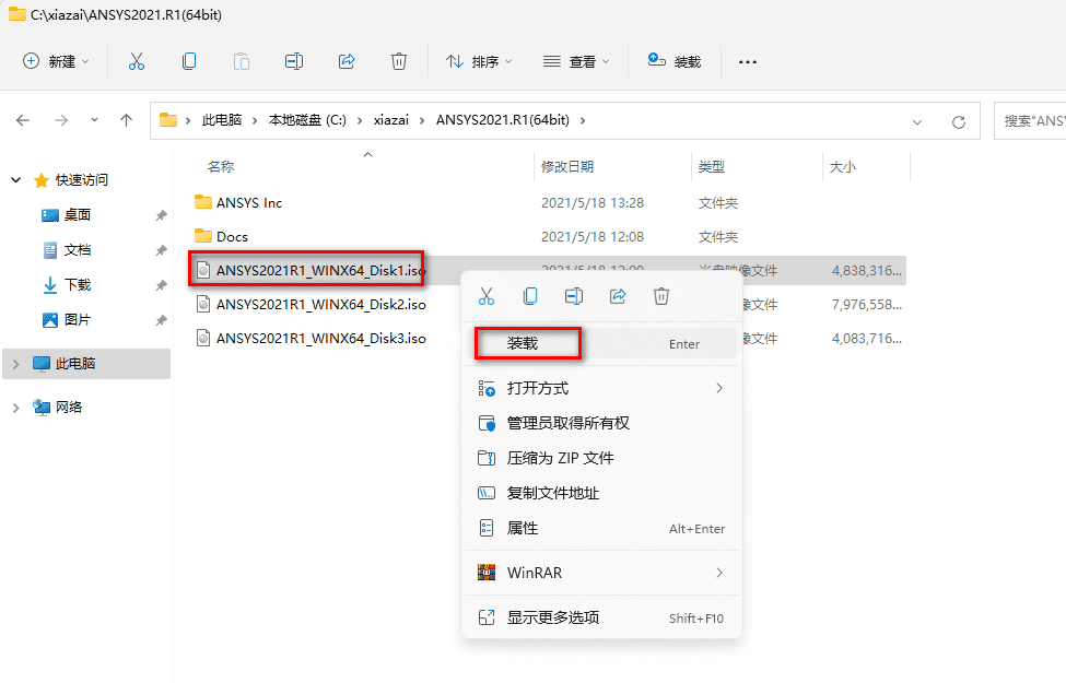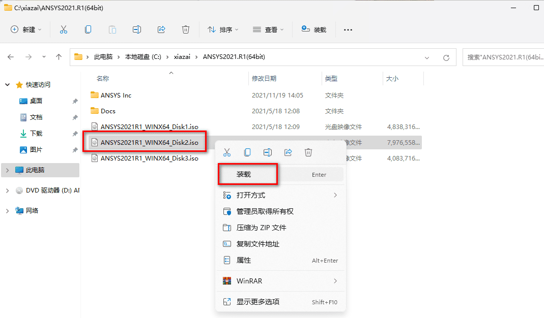 2、打开解压后的文件夹,鼠标右击【ANSYS2021R1_WINX64_Disk1】选择【装载】