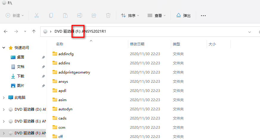 18、进入装载后的文件夹,在路径处查看该磁盘的盘符,下图为【F】盘(以安装电脑实际显示的盘符为准,不同电脑装载后的盘符不同)