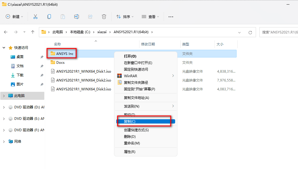 24、打开安装包解压后的【ANSYS2021.R1(64bit)】文件夹,鼠标右击【ANSYS Inc】选择【复制】