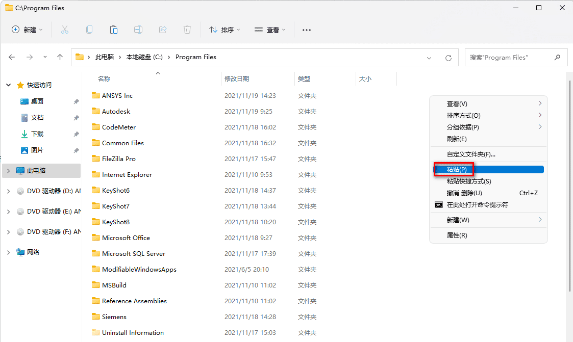 25、打开软件安装位置下的【Program Files】文件夹,在空白处鼠标右击选择【粘贴】。