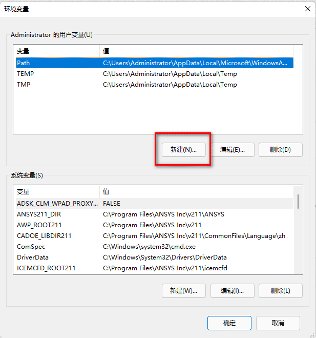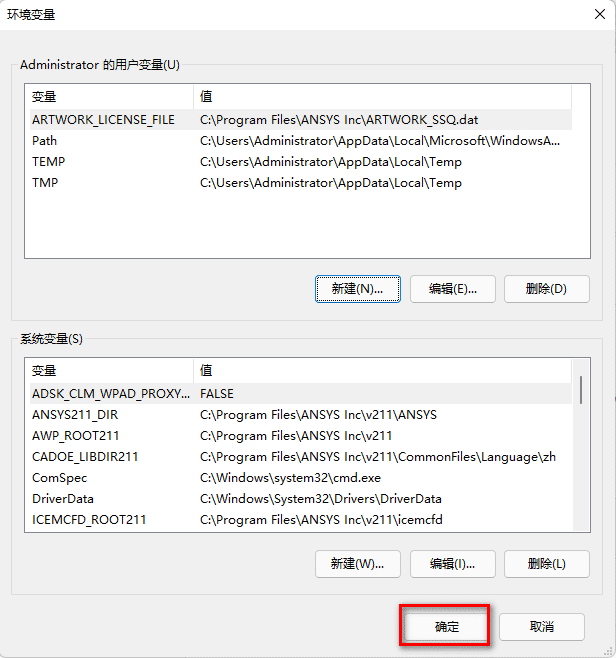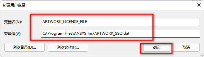 28、在用户变量处:点击【新建】,输入变量名【ARTWORK_LICENSE_FILE】和变量值【C:\Program Files\ANSYS Inc\ARTWORK_SSQ.dat】(如果您不是安装到C盘,请将首字符C修改为您安装的磁盘符),点击【确定】,点击【确定】