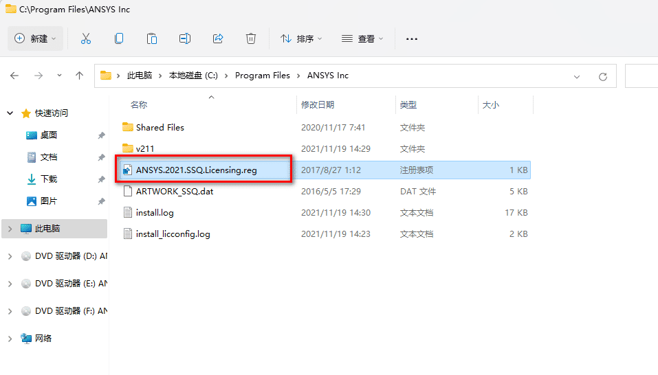 29、打开路径:C:\Program Files\ANSYS Inc(C表示软件安装磁盘) 双击运行【ANSYS.2021.SSQ.Licensing.reg】
