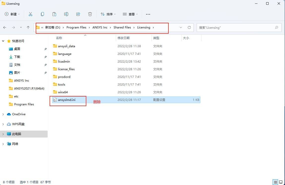 32、重启电脑后,打开软件安装目录:..:\Program Files\ANSYS Inc\Shared Files\Licensing,将ansyslmd.ini这个文件删除