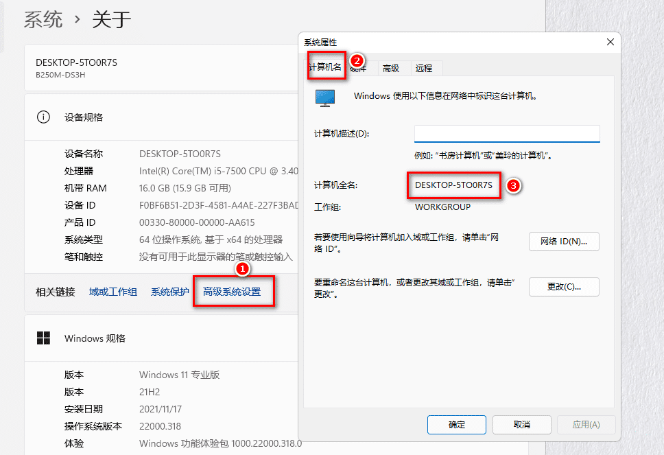 7、鼠标右击桌面【此电脑】选择【属性】,点击【高级系统设置】,点击【计算机名】(全选计算机全名可复制)