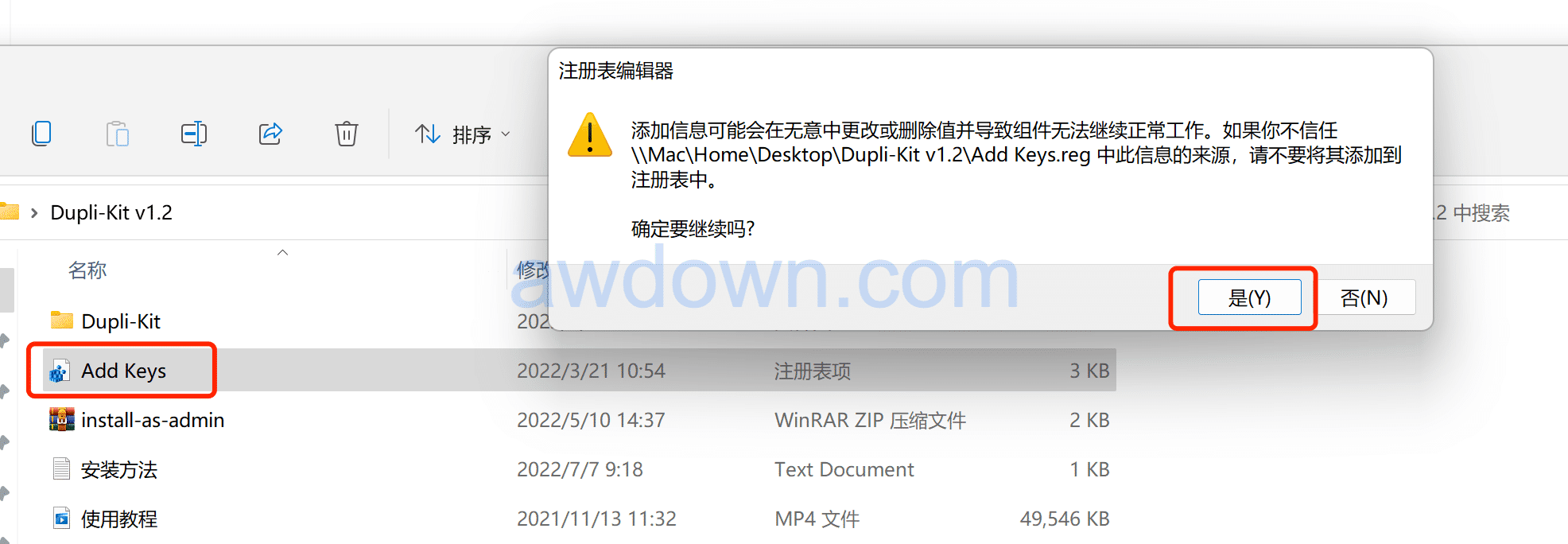 2、运行一下Add Keys.reg,点击是