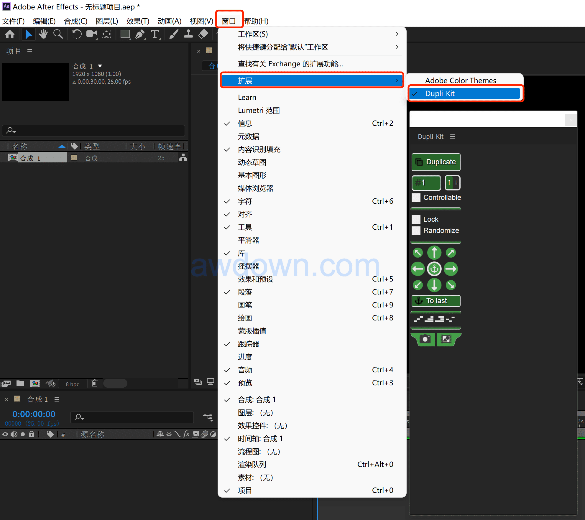 4、在软件顶部菜单 窗口-扩展 下打开Dupli-Kit脚本即可使用。