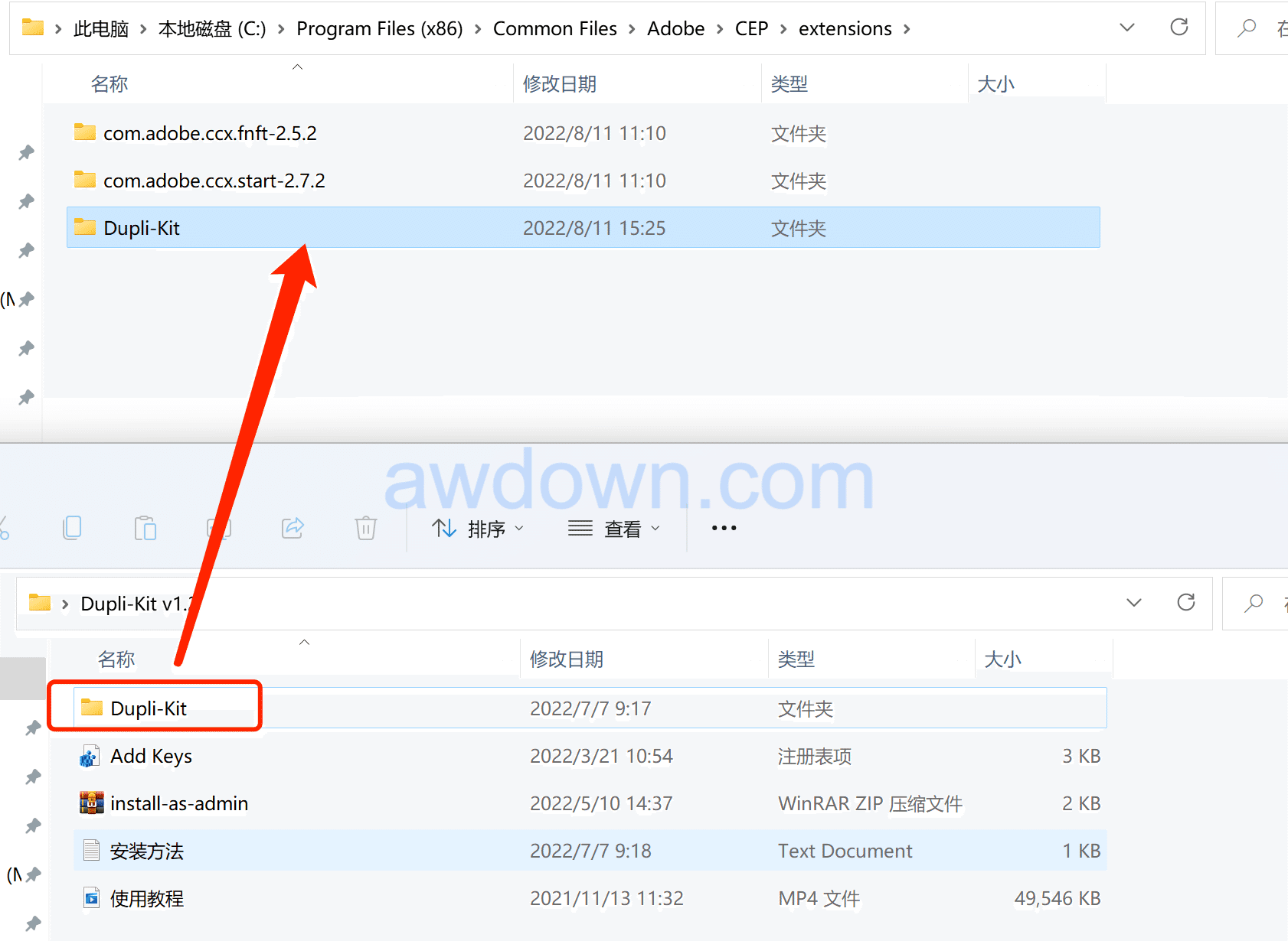 1、拷贝fDupli-Kit文件夹到以下位置: Win : C:\Program Files (x86)\Common Files\Adobe\CEP\extensions\