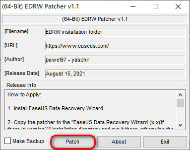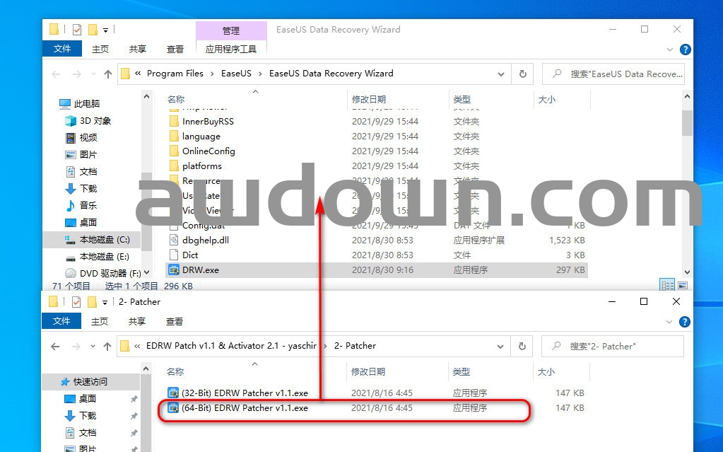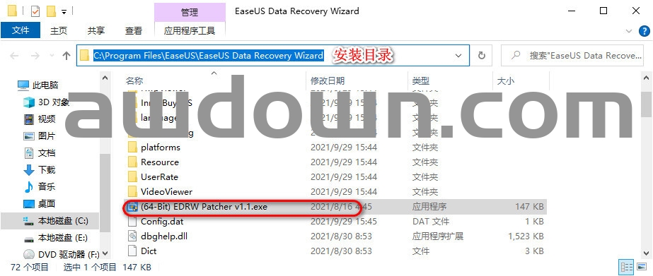 10、打开安装包”2- Patcher”文件夹,将”(64-Bit) EDRW Patcher v1.1.exe”复制到安装目录下;(根据系统情况选择适合的) 注:默认安装目录为:C:\Program Files\EaseUS\EaseUS Data Recovery Wizard