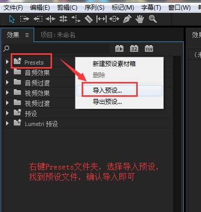 打开PR,在效果预设中,右键选择导入预设。找到预设文件,确认导入即可!