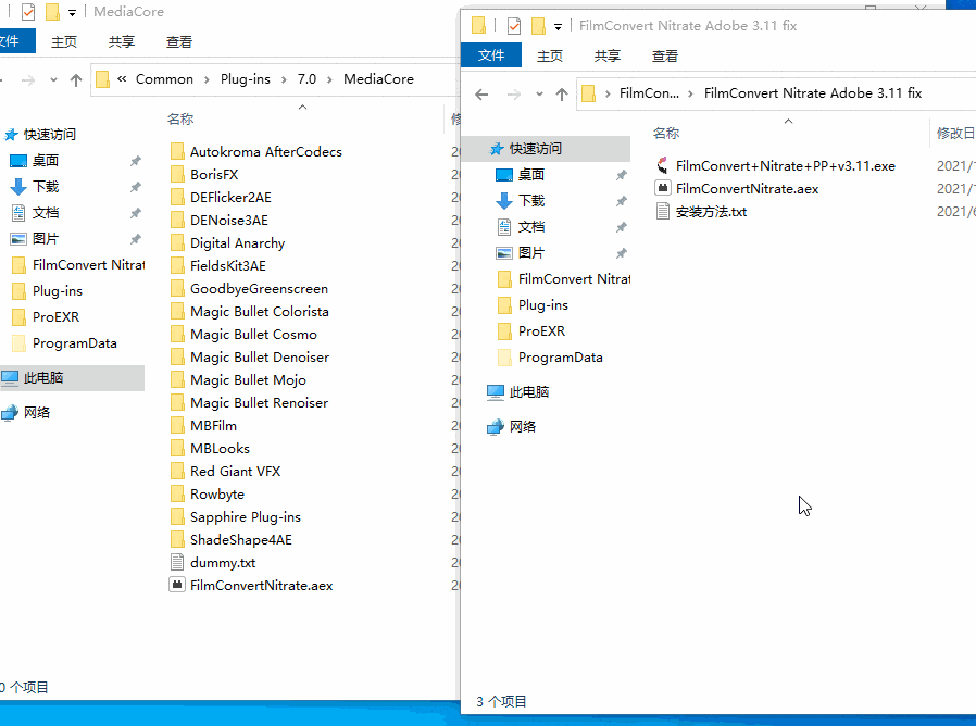 2复制FilmConvertNitrate.aex文件到以下路径: C:\Program Files\Adobe\Common\Plug-ins\7.0\MediaCore
