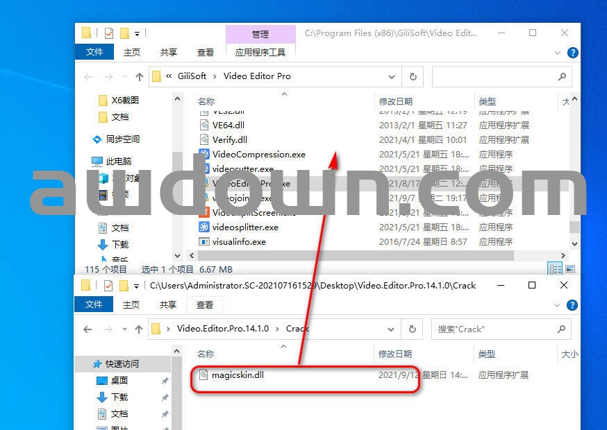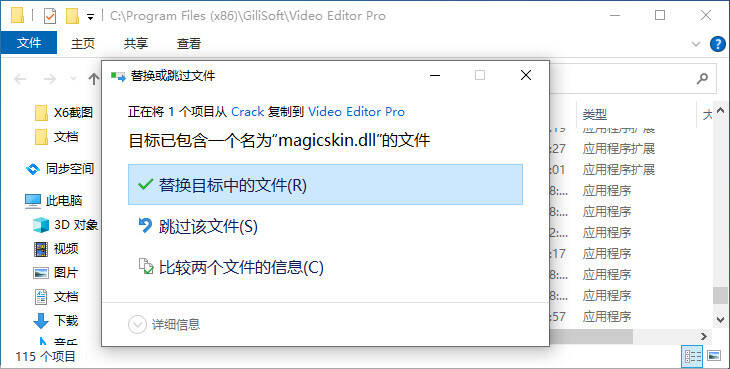 2、打开安装包中的“Crack”,将“magicskin.dll”复制到上一步打开的安装目录下,并“替换目标中的文件”,如下图所示;