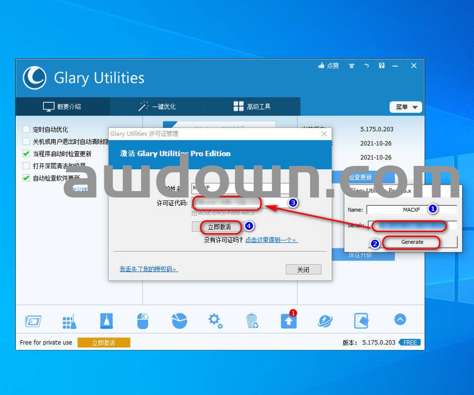 4、输入名称,点击”Generate”,将产生的序列号复制到对应框中,点击”立即激活”;