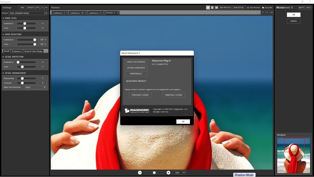 Noiseware 包括三个新的控制集,可实现广泛的微调和卓越的输出质量。现在,您可以按色调和颜色范围调整检测到的噪声级别以及噪声抑制级别。Noiseware 新的 DetailGuard 根据色调范围和处理程度保留图像细节,保护图像细节不被过度改变。