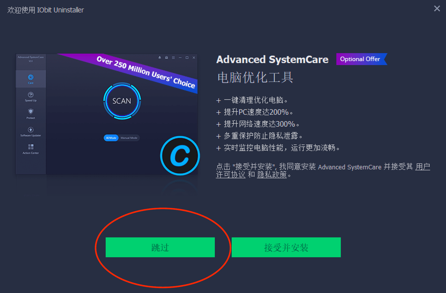 1、点击跳过,不要安装推荐的任何软件。