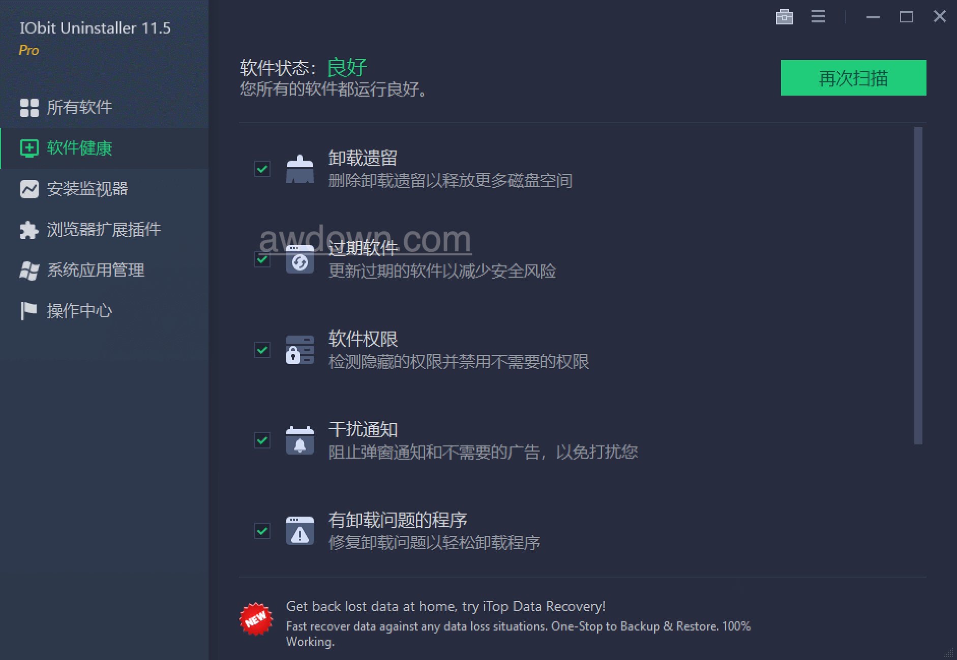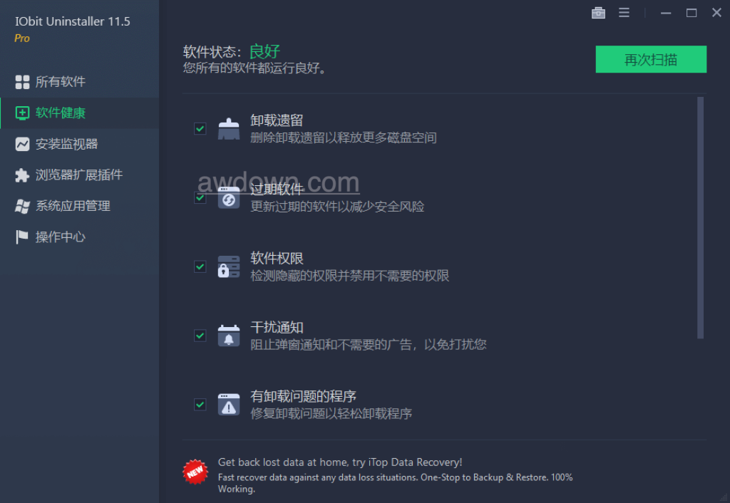 IObit Uninstaller 极简好用的卸载软件,与最新的卸载技术集成,即使在 Windows“添加或删除程序”失败时,也可以帮助您轻松删除不需要的程序。最吸引人的部分是它在每次卸载之前制作一个还原映像。通过新添加的工具栏卸载模块,可帮助您彻底删除不需要的工具栏。