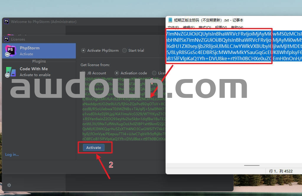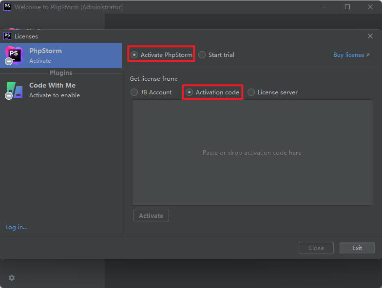 10弹出注册页面,选择Activate PhpStorm ,然后选定Activation code,留作待用