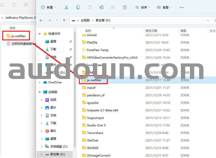 15返回安装包,将ja-netfilter文件夹放到指定位置(后期不要移动!),小编这里以放到D盘为例