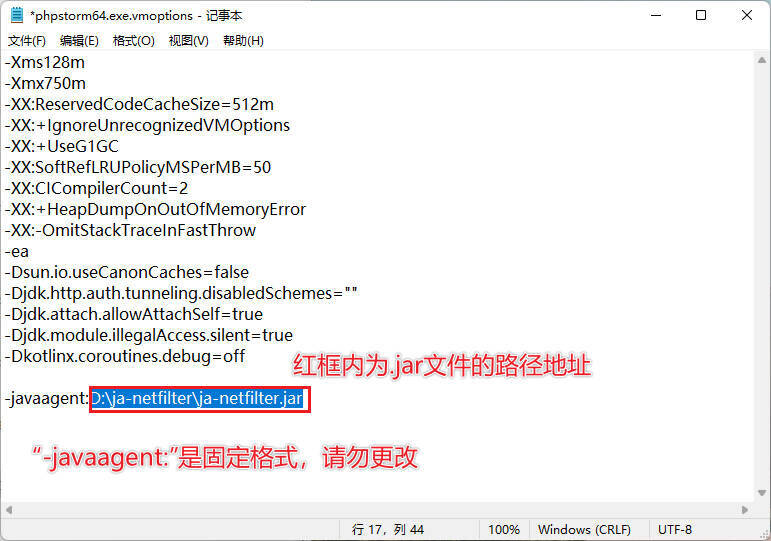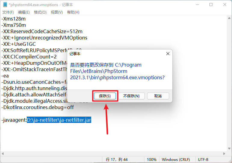 19在文本后面填写-javaagent:D:\ja-netfilter\ja-netfilter.jar (-javaagent:后面粘贴刚刚复制的ja-netfilter.jar文件所在路径), 填写完成然后保存即可。