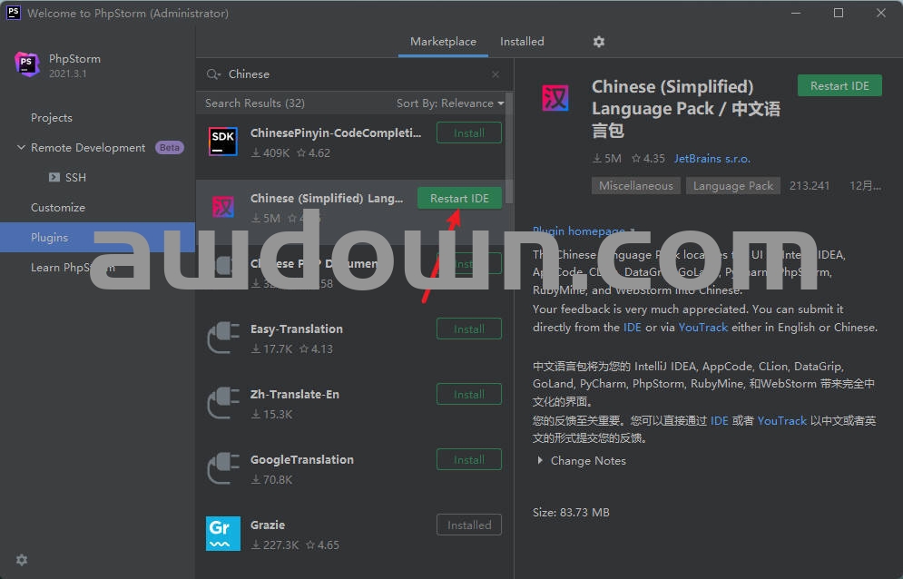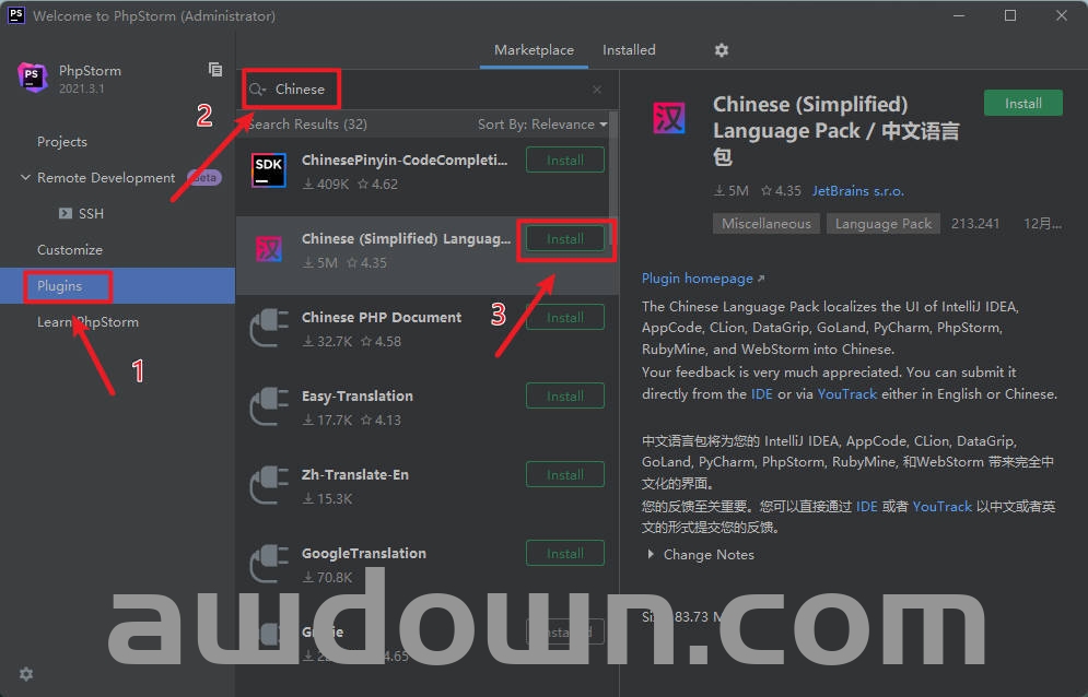 1选择Plugins,在搜索框中输入Chinese,找到中文语言包点击Install安装