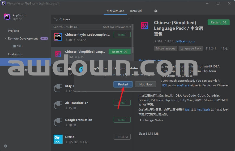 2安装完成后,点击Restart IDE