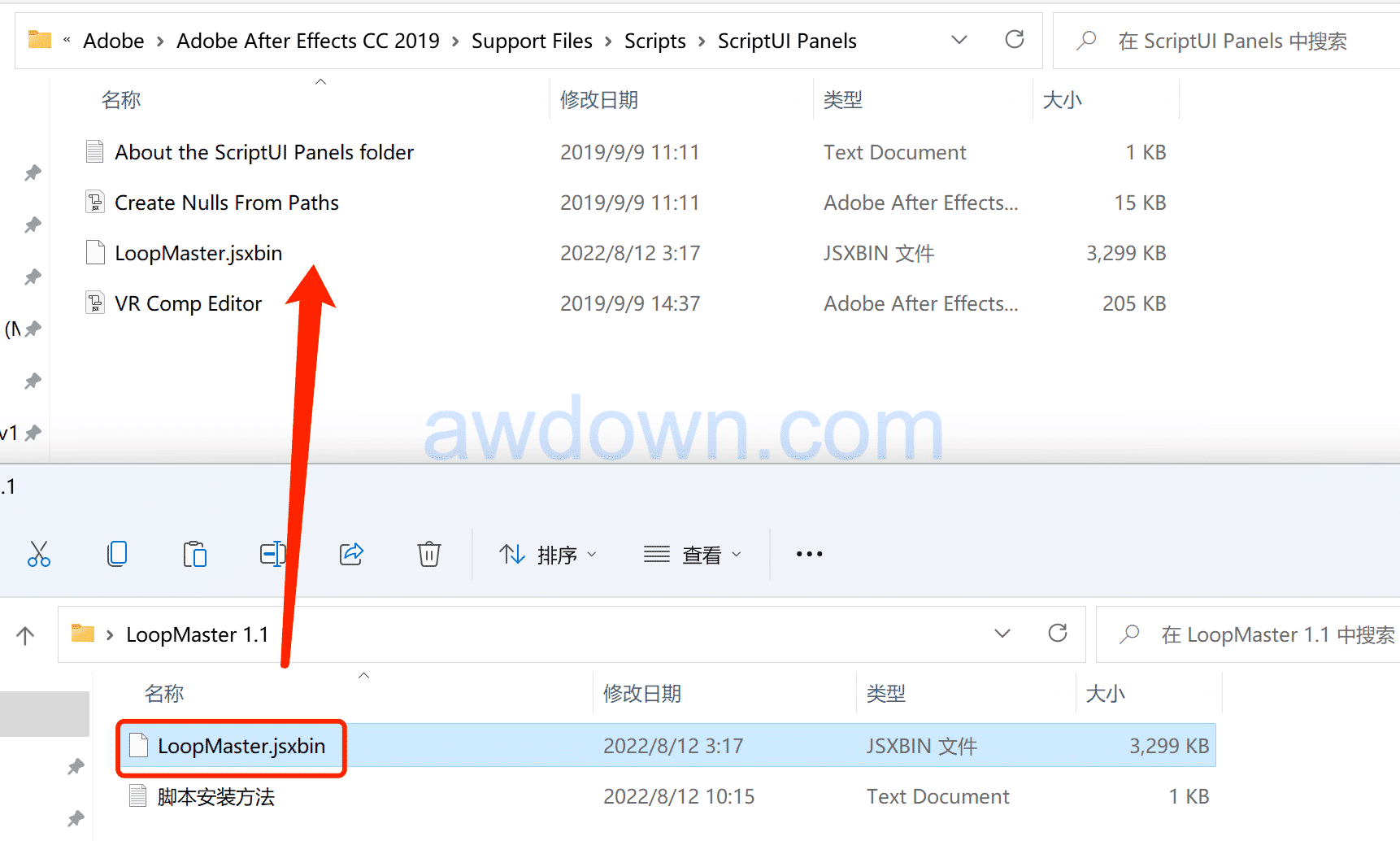 1、复制LoopMaster.jsxbin文件到AE脚本目录: Win:…Adobe After Effects CC\Support Files\Scripts\ScriptUI Panels\
