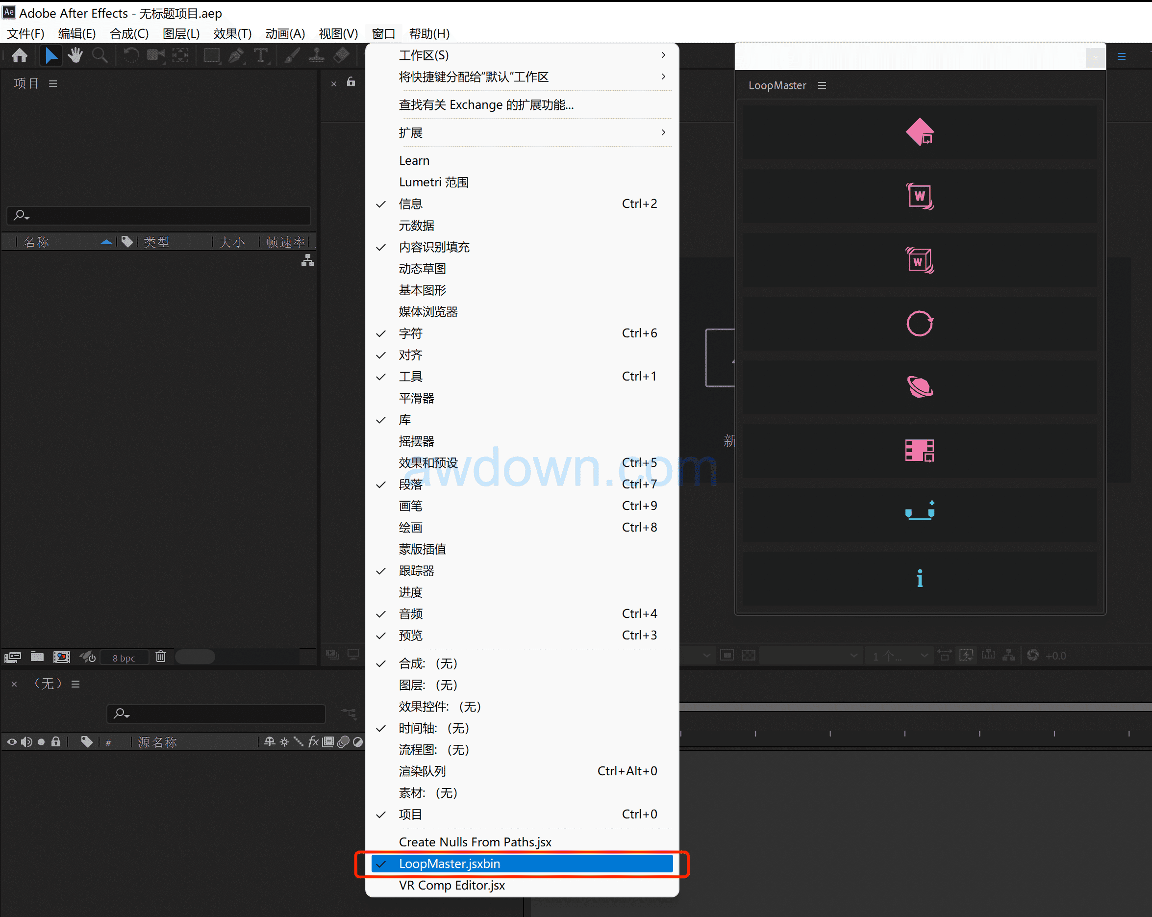 3、在软件顶部window窗口菜单下即可看到LoopMaster.jsxbin脚本