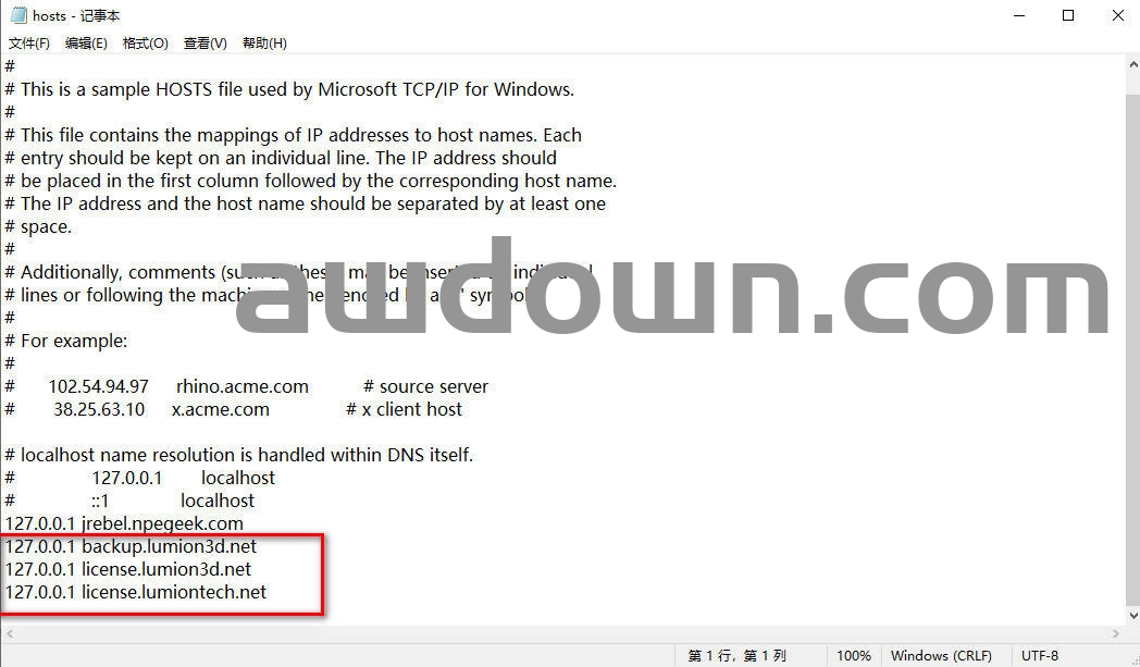 10、将127.0.0.1 backup.lumion3d.net,127.0.0.1 license.lumion3d.net,127.0.0.1 license.lumiontech.net复制到hosts记事本末,点击文件选择保存