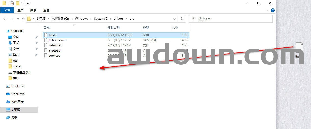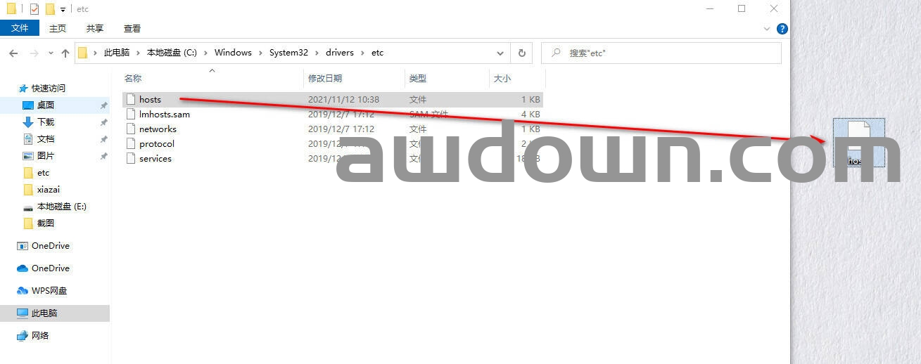 9、打开路径C:\Windows\System32\drivers\etc,将hosts文件复制到桌面并打开(选择记事本)