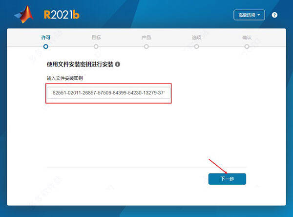 5、在这里输入安装密钥:62551--10698-58393-44718-32560-10501-40058-34454,点击下一步即可;