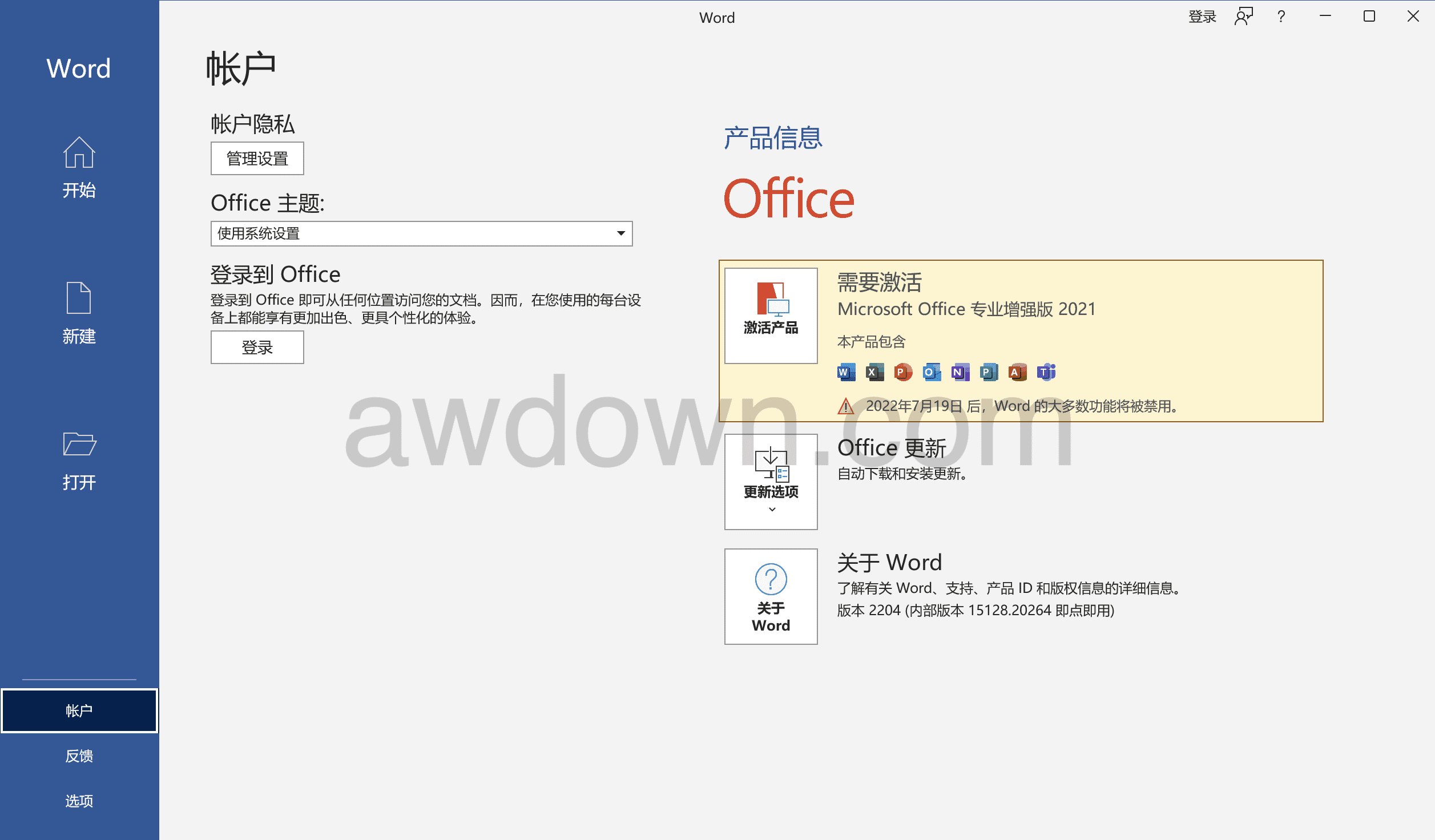 5、打开后,为未激活状态。不用慌:请使用kms工具对其进行启用:https://www.awdown.com/ms-kms.html