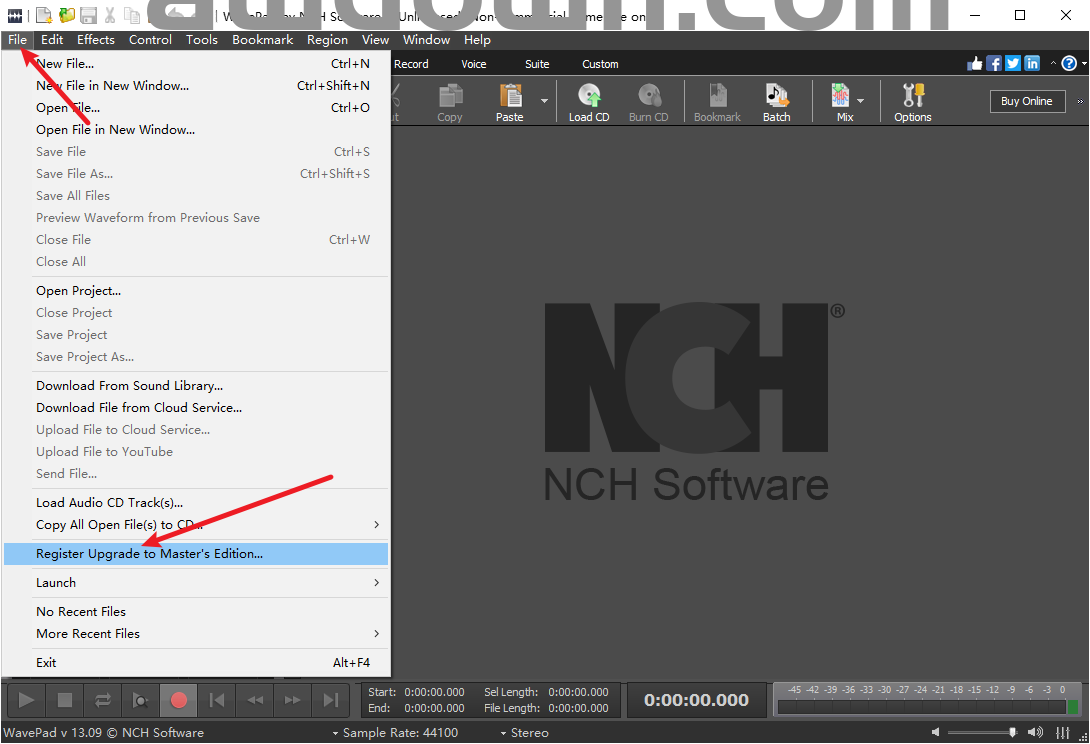 9、打开软件,点击“File”,在下拉菜单中找到“Register Upgrade to Master's Edition...”并点击打开。