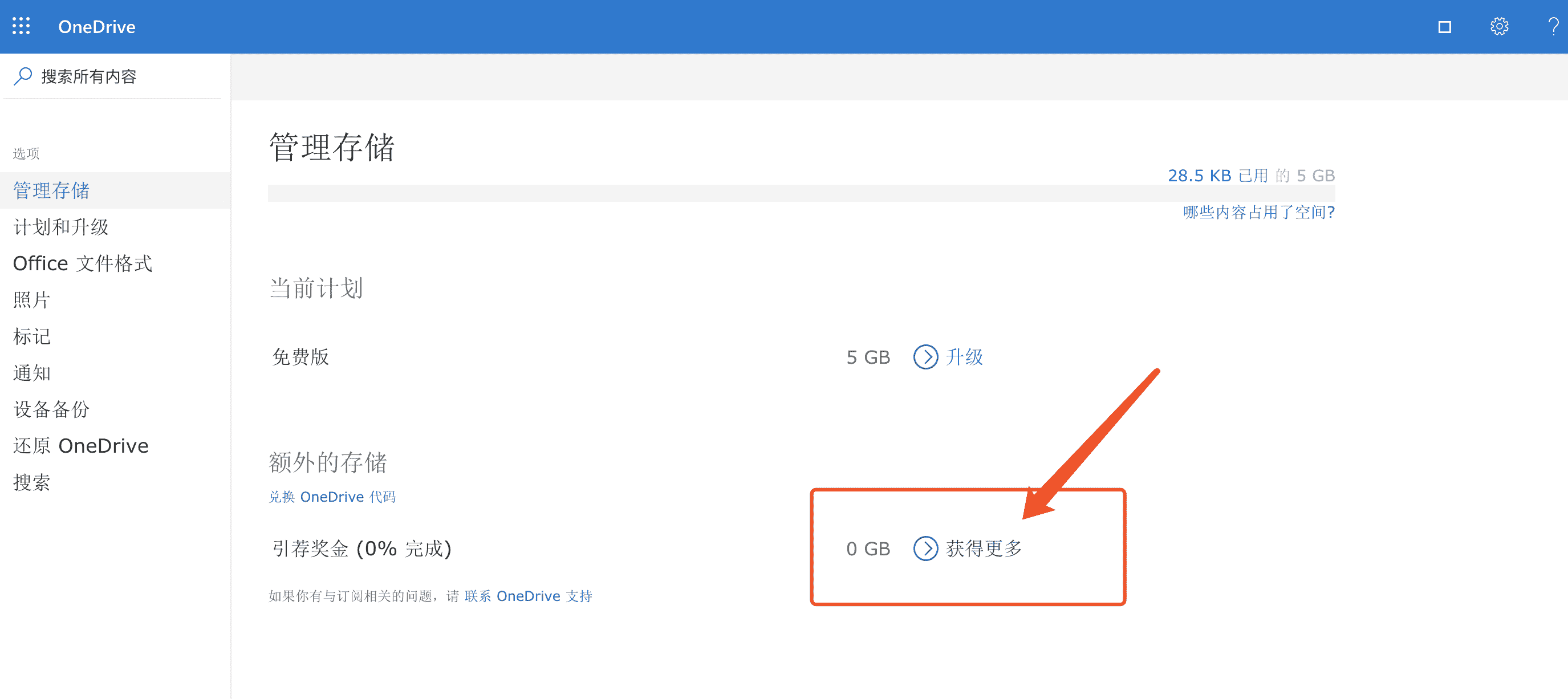 Onedrive原本注册就有7G,然后还可以额外扩容8G,一共就是15G,方法如下: