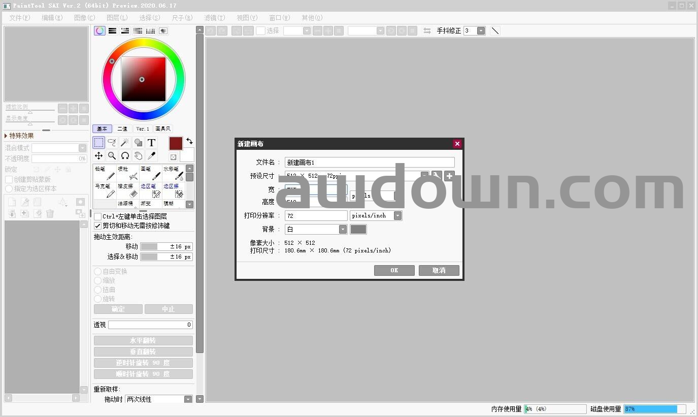 PaintTool SAI2是一款很受欢迎的绘图软件,它是由日本SYSTEMAX公司正在销售的产品,目前受到了非常多绘画者的喜爱,相比于其它软件,它具备体积小巧、运行稳定、配置要求低等优势,可以提供给数字插画家以及绘画爱好者一个轻松的创作环境。这些画笔还支持调节,画笔大小、边缘硬度、浓度笔压都能自定义,自己可以设定出符合自己绘画习惯的画笔。不仅如此,绘画时,用户还能任意旋转、翻转画布,缩放时反锯齿,并且拥有强大的墨线功能,可以完全用墨或色渲染出轮廓线,更有先进的算法,让初学者轻松就能画出流畅顺滑的线条。
