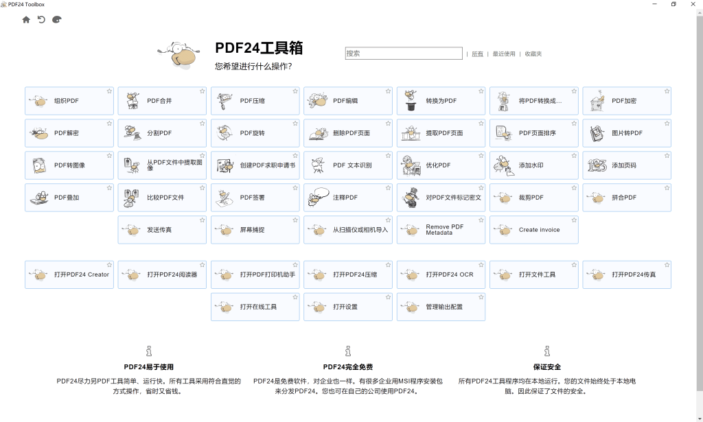 pdf24 creator创建工具,具有各式编辑PDF文件的功能。编辑器包括了许多十分实用的功能。您可以分割,合并和重新排列页面,为PDF加上密码,更改PDF文档的属性等等。