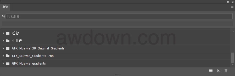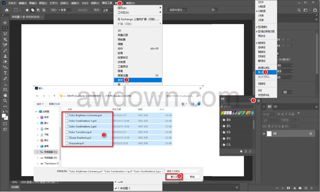 2打开PS软件,点击窗口>渐变>三条横线>导入渐变,点击后缀为.grd 的文件,点击载入