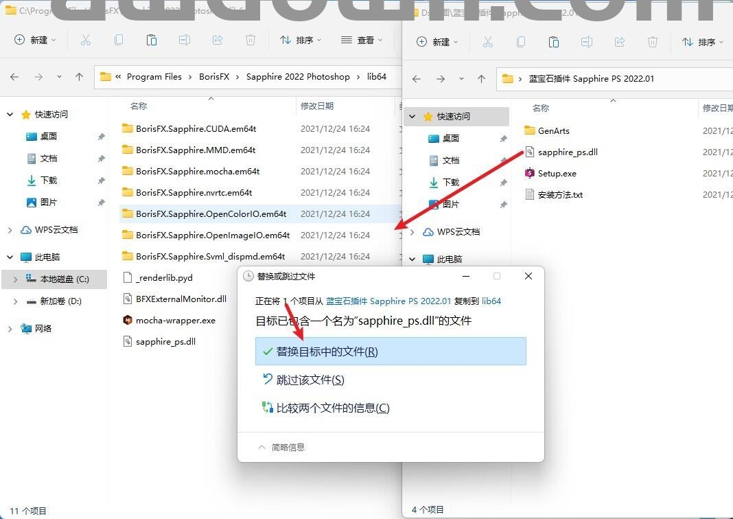 11复制sapphire_ps.dll文件到安装目录,如以下路径: C:\Program Files\BorisFX\Sapphire 2022 Photoshop\lib64