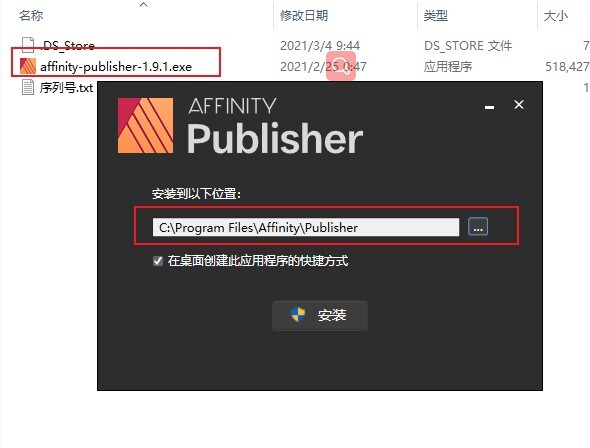 1、在本站下载好,双击affinity-publisher-1.9.1.exe安装,然后选择安装目录