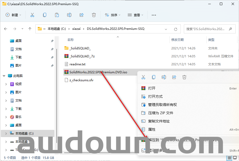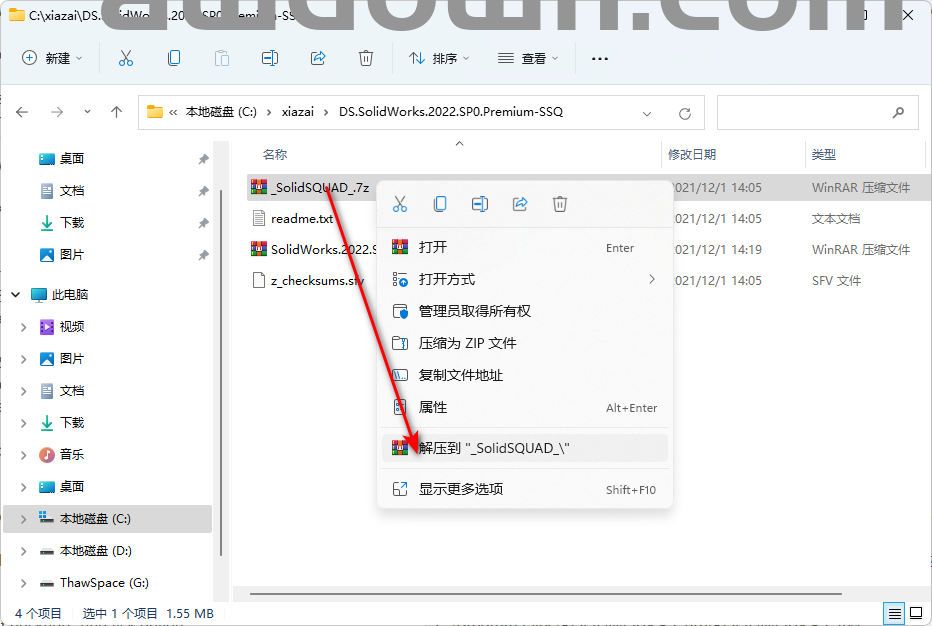 12、鼠标右击【SolidWorks.2022.SP0.Premium.DVD】文件夹,选择【解压到 SolidWorks.2022.SP0.Premium.DVD】文件夹