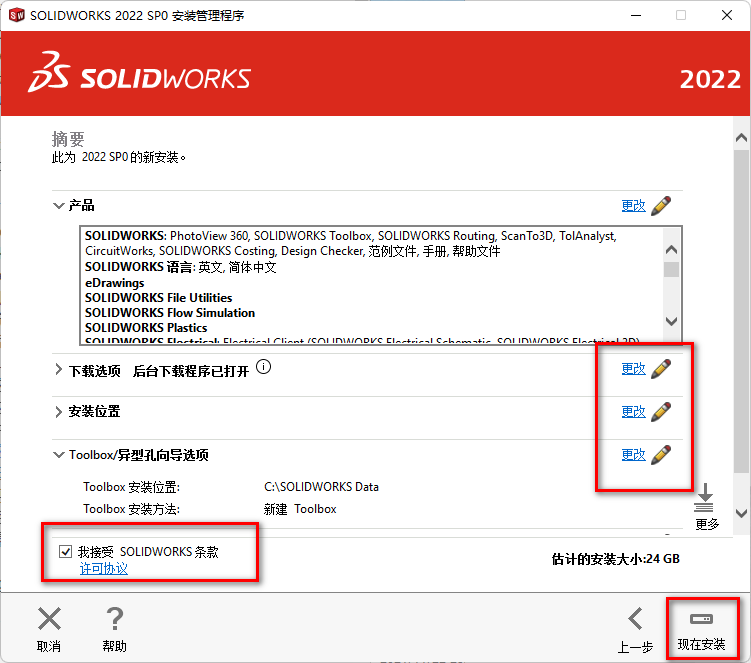 18、点击【更改】可更改相对应的位置,勾选【我接受..】,点击【现在安装】