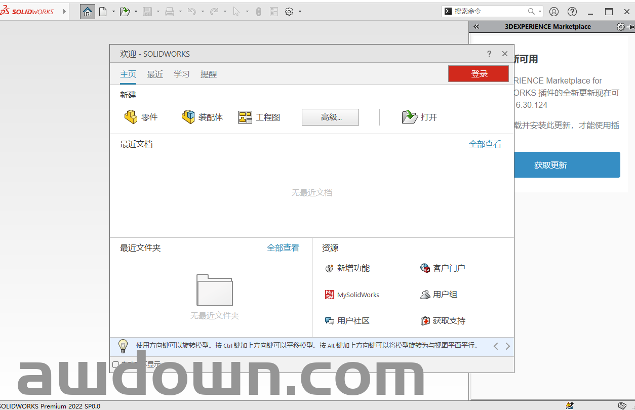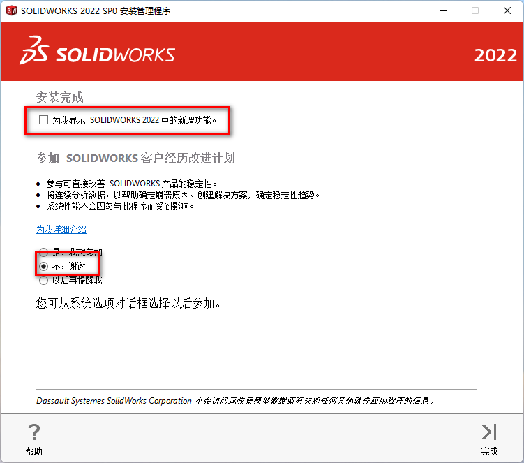 21、取消勾选【为我显示SOLIDWORKS2020中的新增功能】,选择【不,谢谢】,点击【完成】