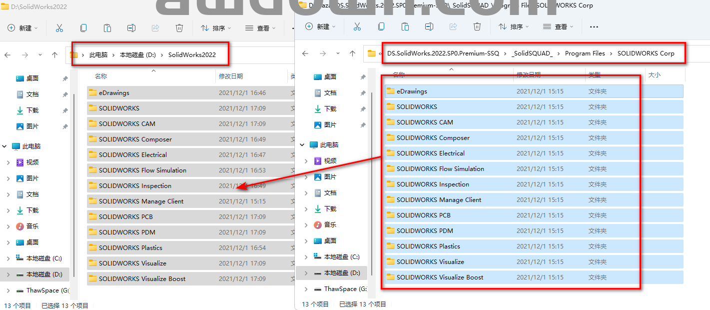 23、打开安装包解压后的【SolidSQUAD\Program Files\SOLIDWORKS Corp】文件夹,将所有文件复制到软件安装所在的文件夹
