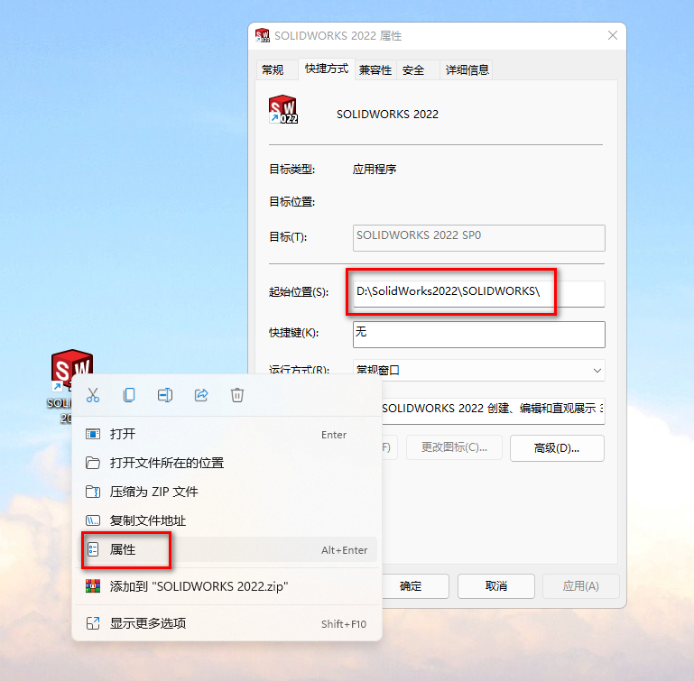 24、附”软件安装路径“查看方法:鼠标右击桌面【SOLIDWORKS 2022】图标选择【属性】显示的起始位置为【D:\SolidWorks2022\SOLIDWORKS\ 】,则软件安装路径为:D:\SolidWorks2022