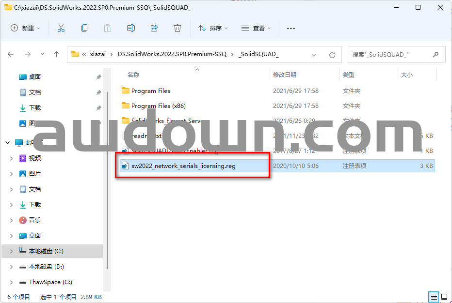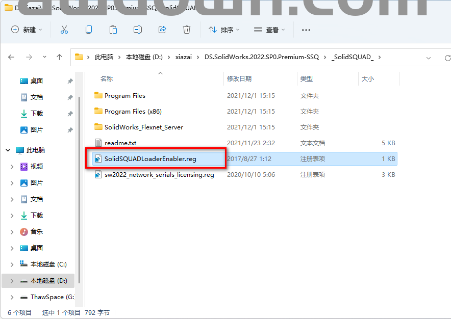 4、打开解压后【SolidSQUAD】文件夹,双击【sw2022_network_serials_licensing】