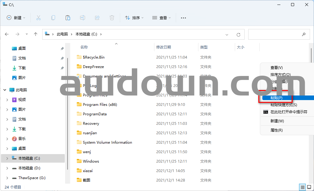 8、打开电脑【C盘】,在空白处鼠标右击选择【粘贴】